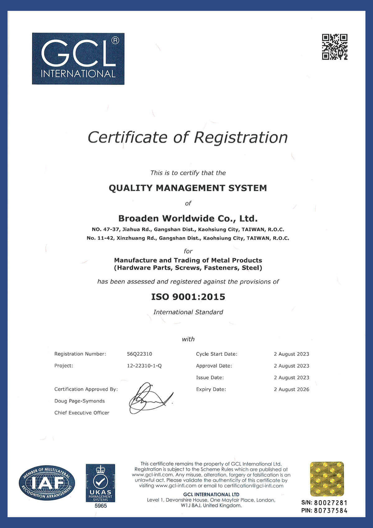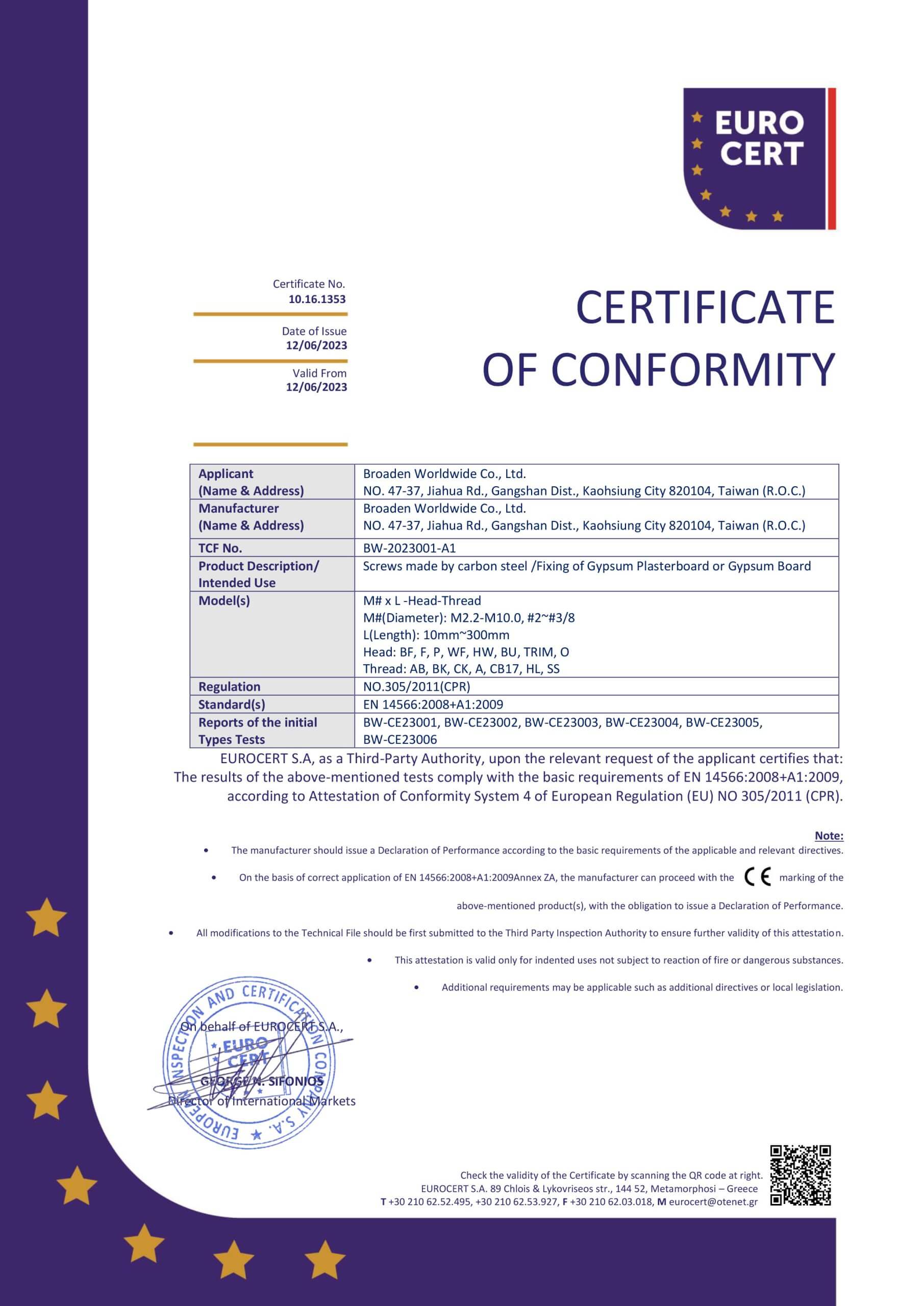 Broaden Worldwide Co., Ltd is an ISO-9001 Certified Quality Supplier-Manufacturer of Australian Standard AS3566 Self-drilling and Self-tapping Screws in various coatings for steel to steel to steel to timber applications. Our headquarters is in Taiwan and we operate sales and marketing offices in India and Thailand.